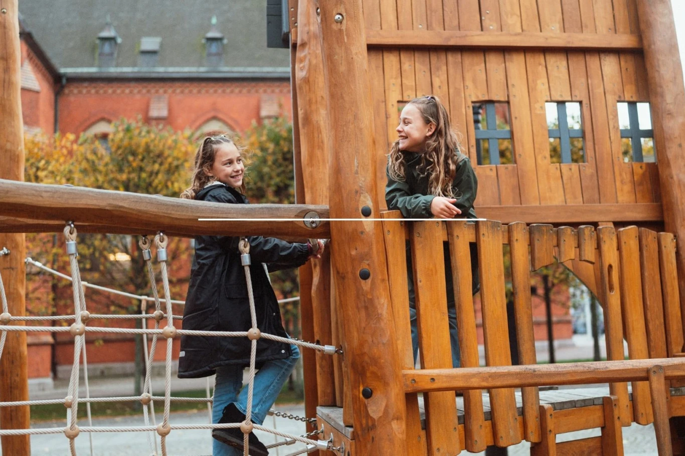 Lekplatsen bjuder på äventyr som utmanar både balans och upptäckarlust. Klättra upp, ta dig mellan husen via hängbroar, svinga dig i ringar och hoppa ner på marken för att fortsätta mot nästa lekfulla utmaning.